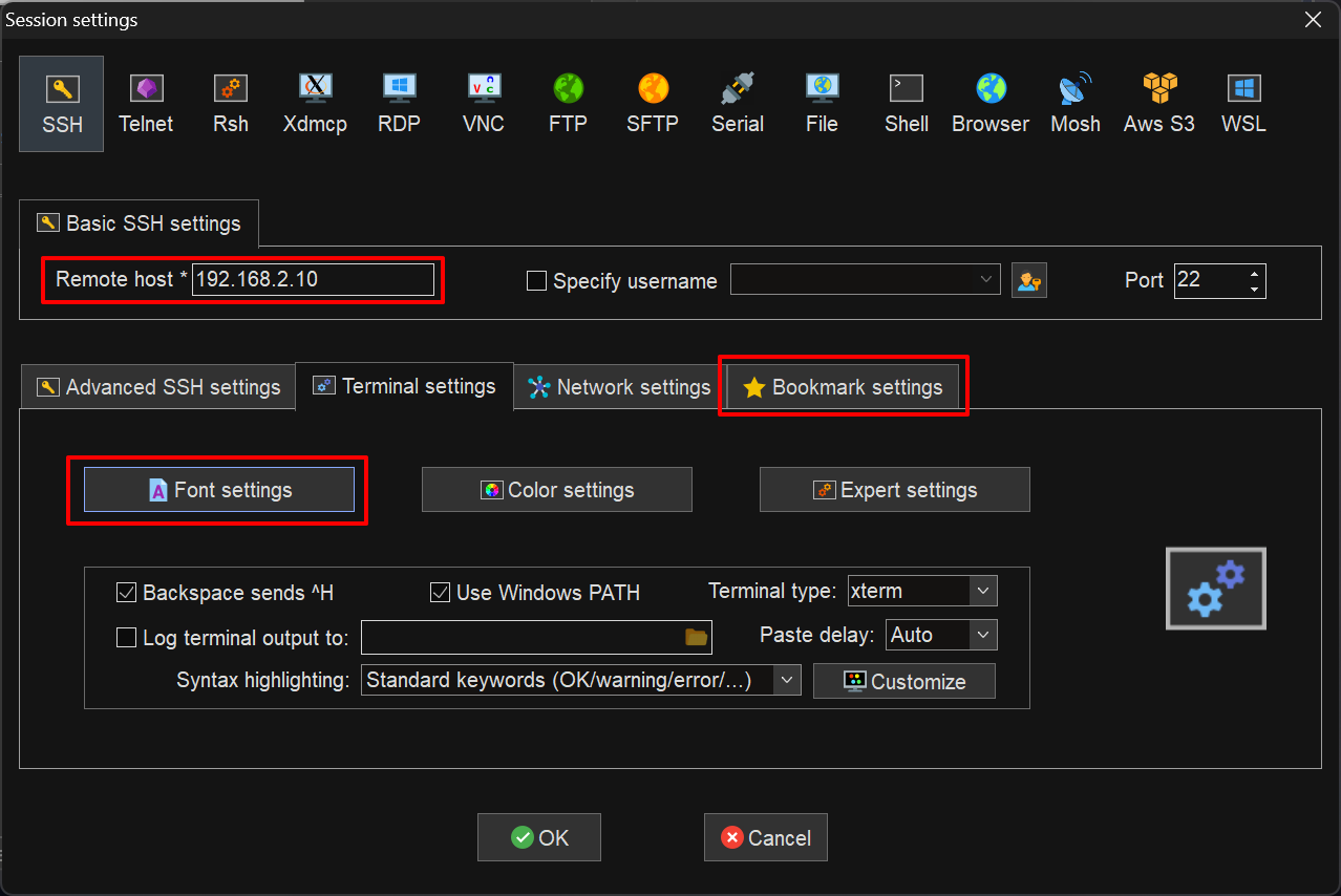 - Bookmark settings 탭으로 이동해 Session name을 docker1로 변경