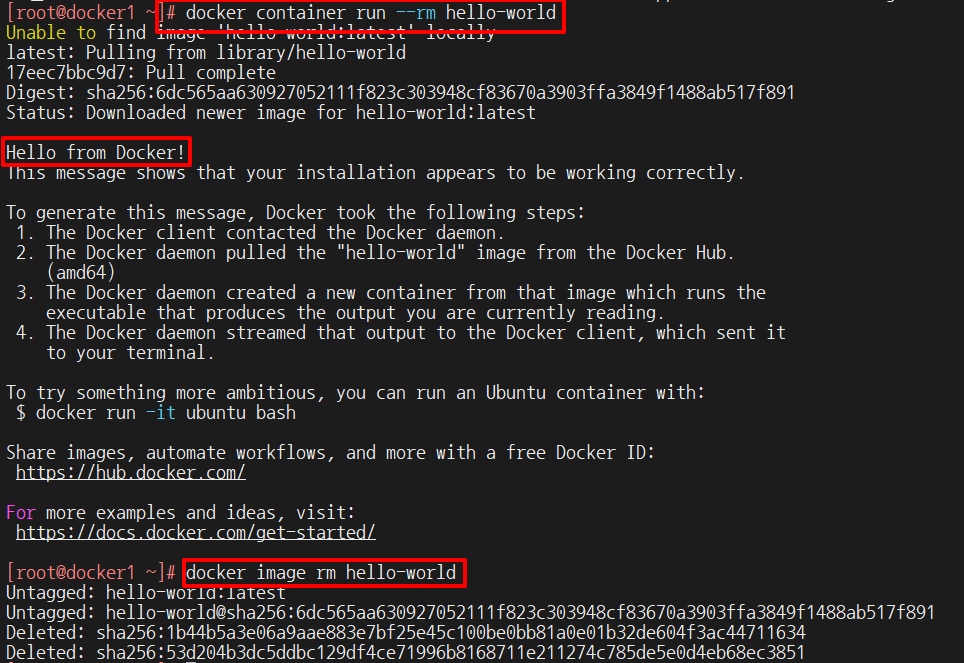 “Hello from Docker!” 메시지가 나오면 설치 성공입니다! 🎉
