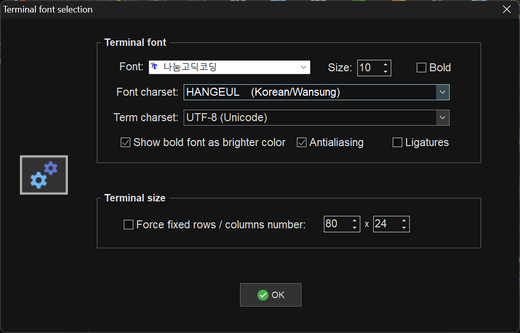 - 폰트를 나눔고딕 코딩으로 설정 Font charset은 HANGEUL로 설정