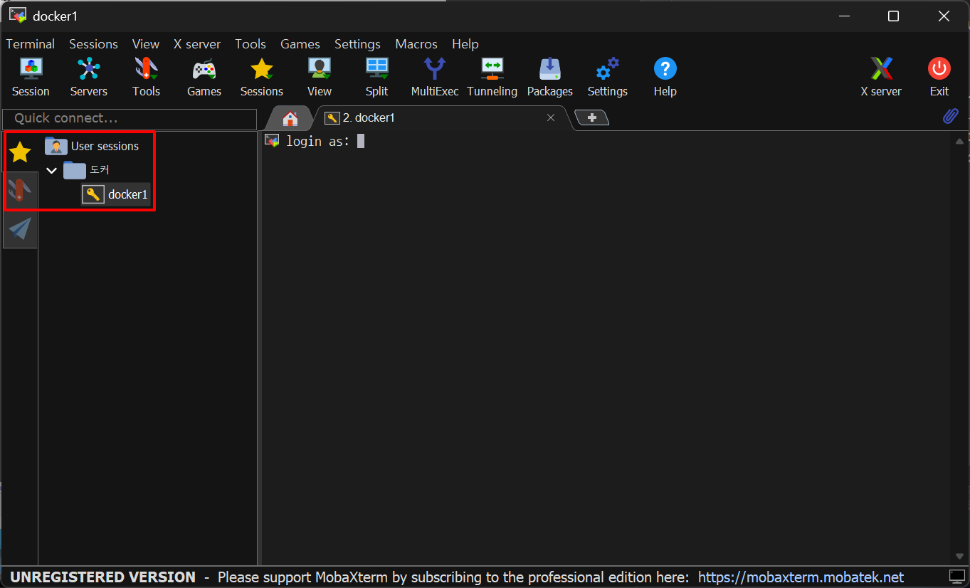 - User sessions만 남기고 우클릭 → New folder → 폴더 이름을 도커로 지정
