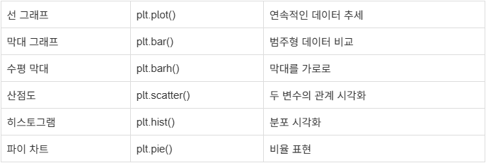 - 기본: plt.plot() → 선 그래프 / plt.bar() → 막대 / plt.scatter() → 산점도