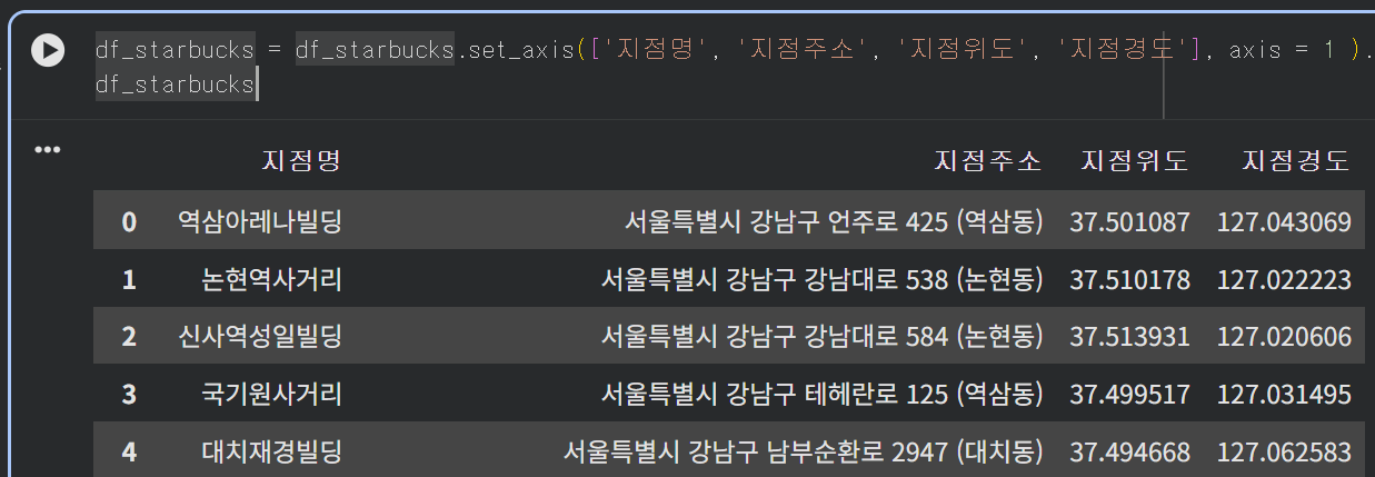 df_starbucks = df_starbugs.set_axis(['지점명', '지점주소', '지점위도', '지점경도'], axis=1) \